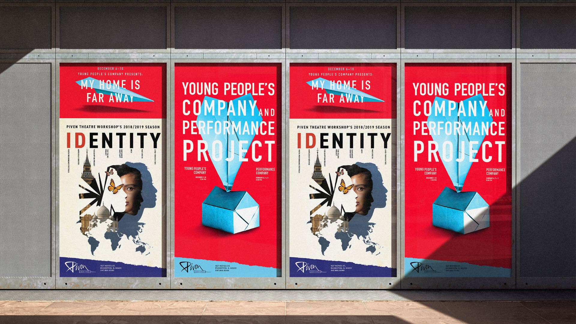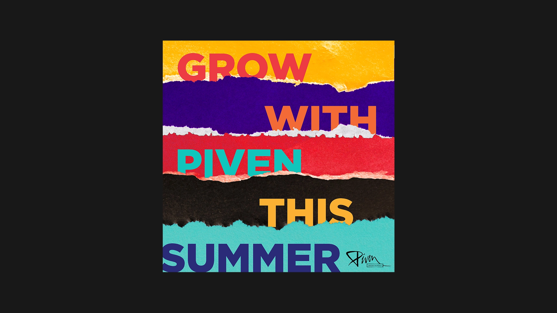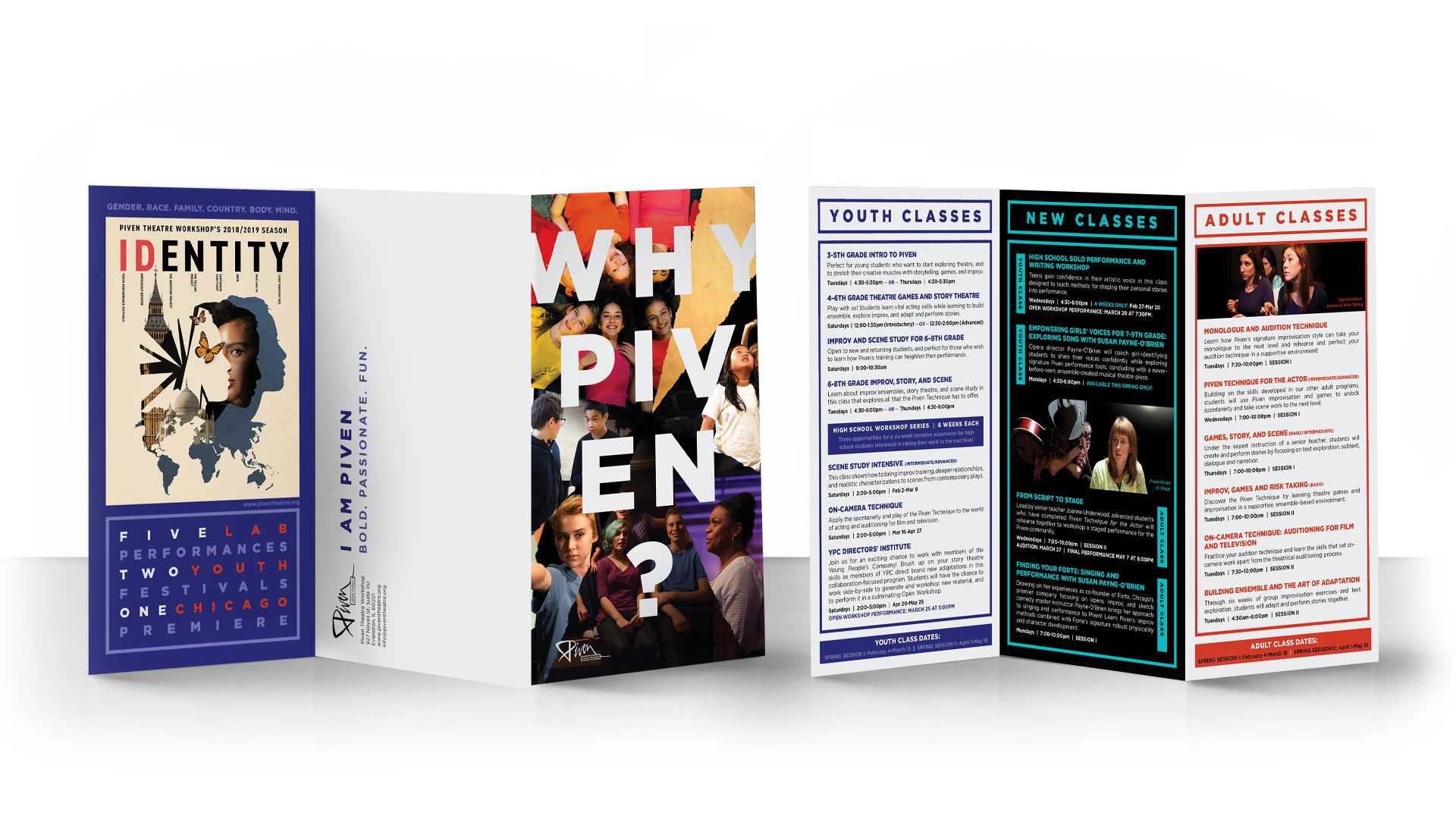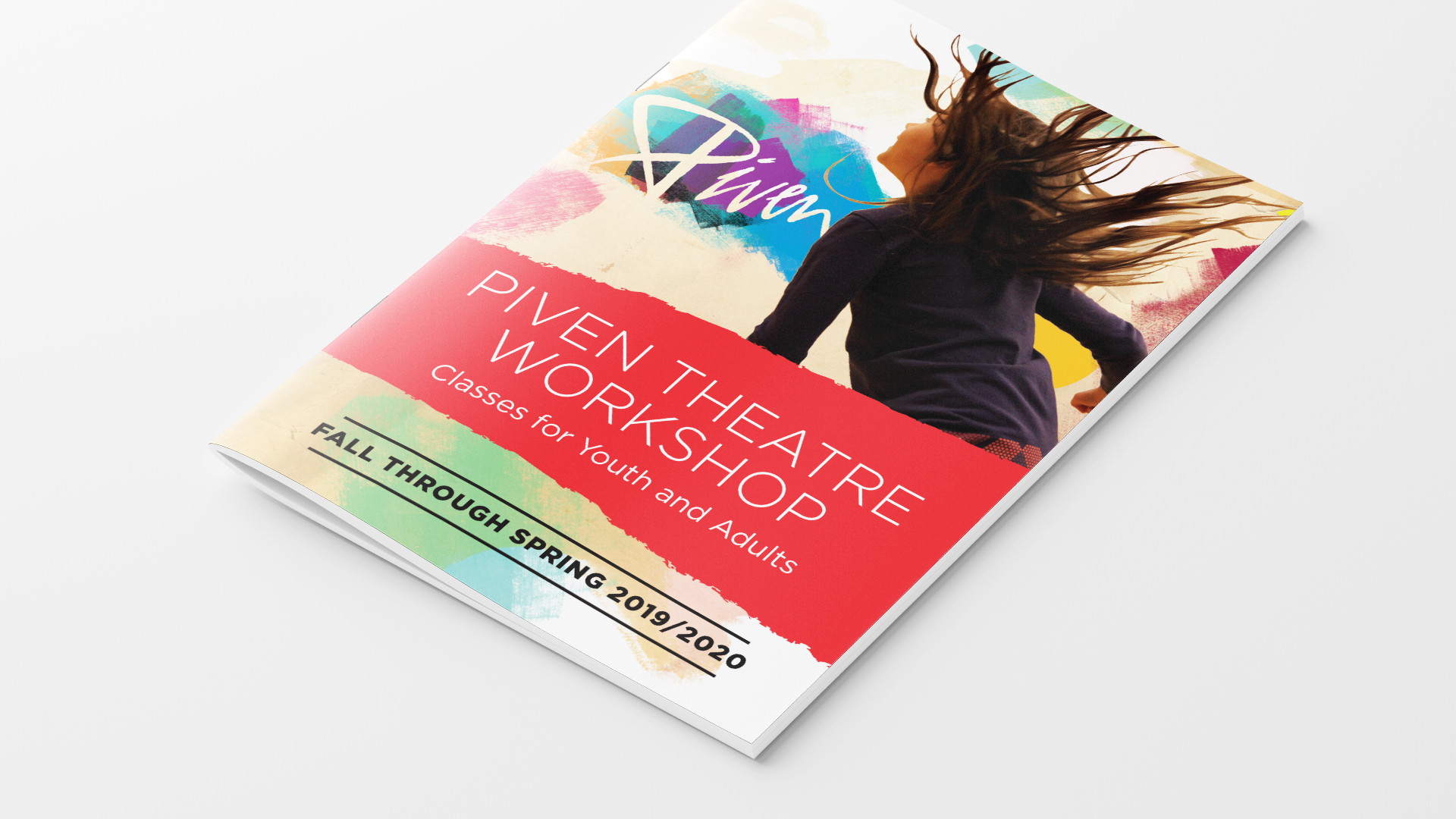 Piven Theatre Workshop is a renowned theater and acting school in Evanston, Illinois with a strong emphasis on community and outreach. Their aesthetic is colorful and playful, while retaining a level of sophistication. Every season I find new ways to use Piven’s signature “torn paper” element, from origami to hand-painted paper to photo collage using paper textures. The key is to create subtle visual distinctions between all the different programs that Piven offers.
