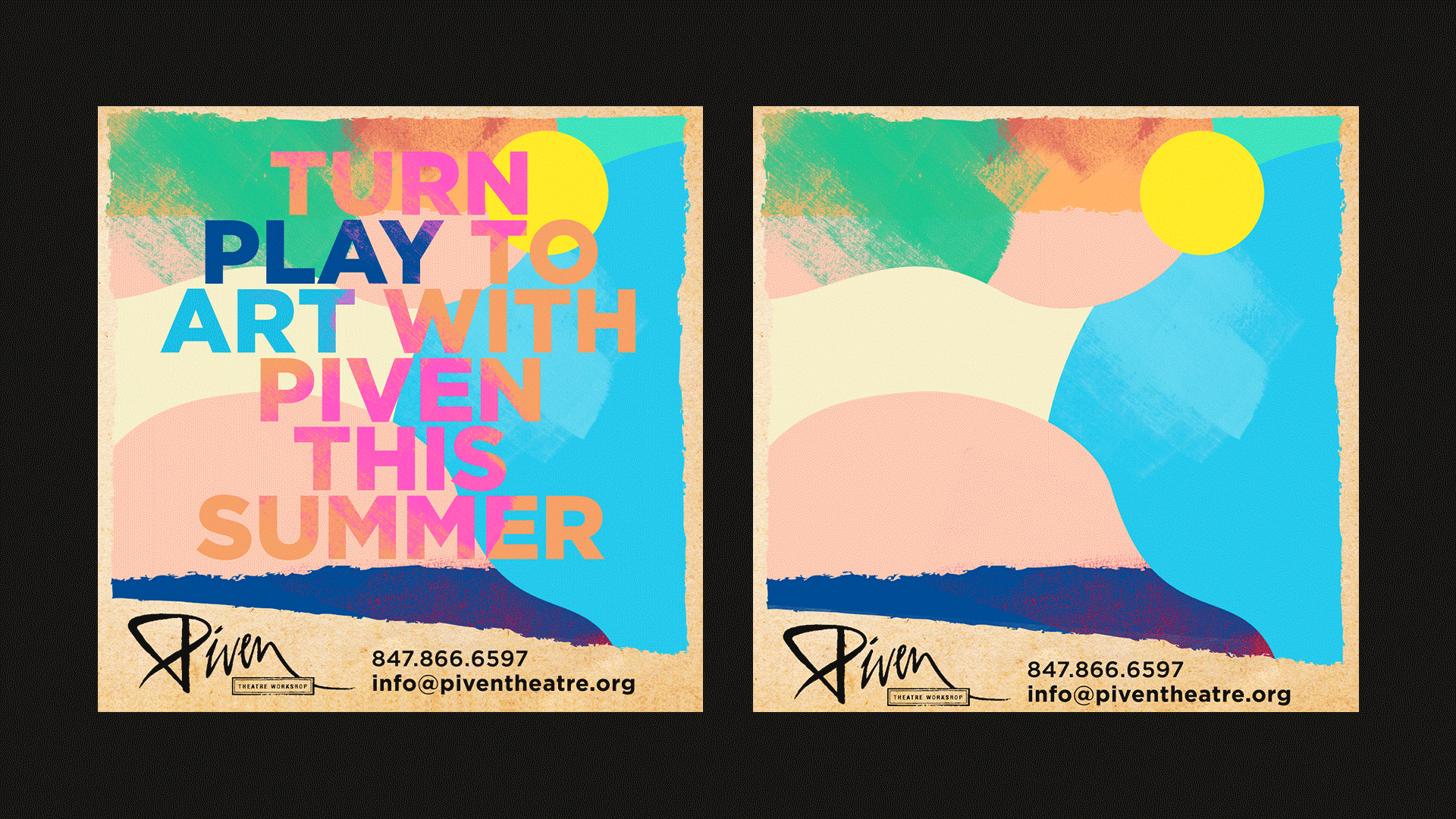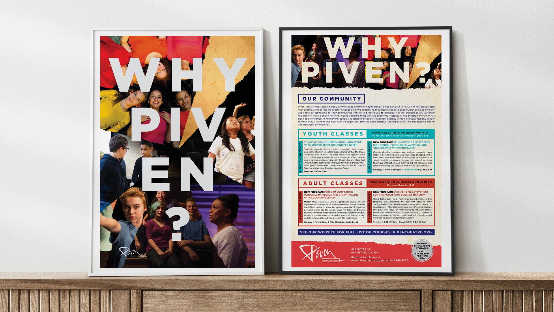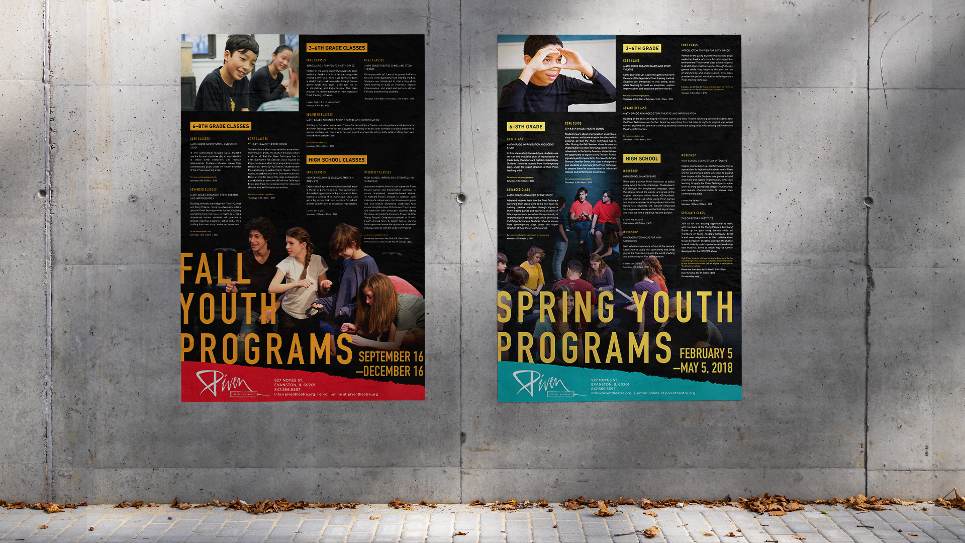 Piven Theatre Workshop is a renowned theater and acting school in Evanston, Illinois with a strong emphasis on community and outreach. Their aesthetic is colorful and playful, while retaining a level of sophistication. Every season I find new ways to use Piven’s signature “torn paper” element, from origami to hand-painted paper to photo collage using paper textures. The key is to create subtle visual distinctions between all the different programs that Piven offers.