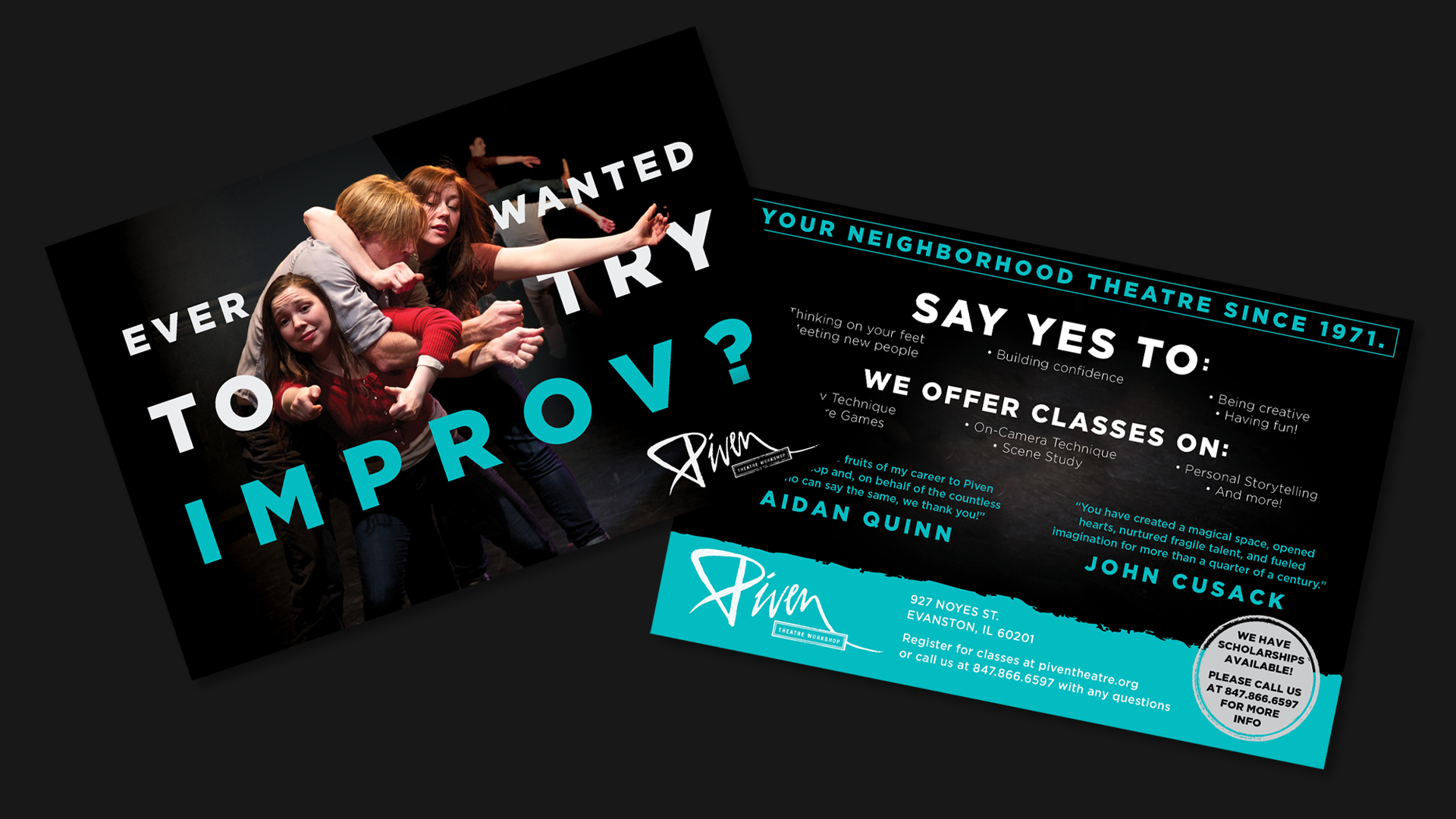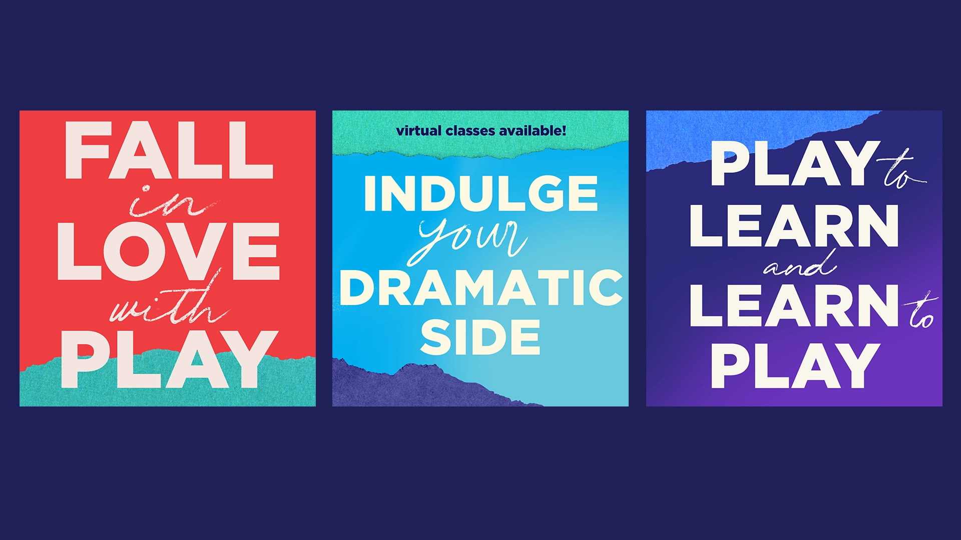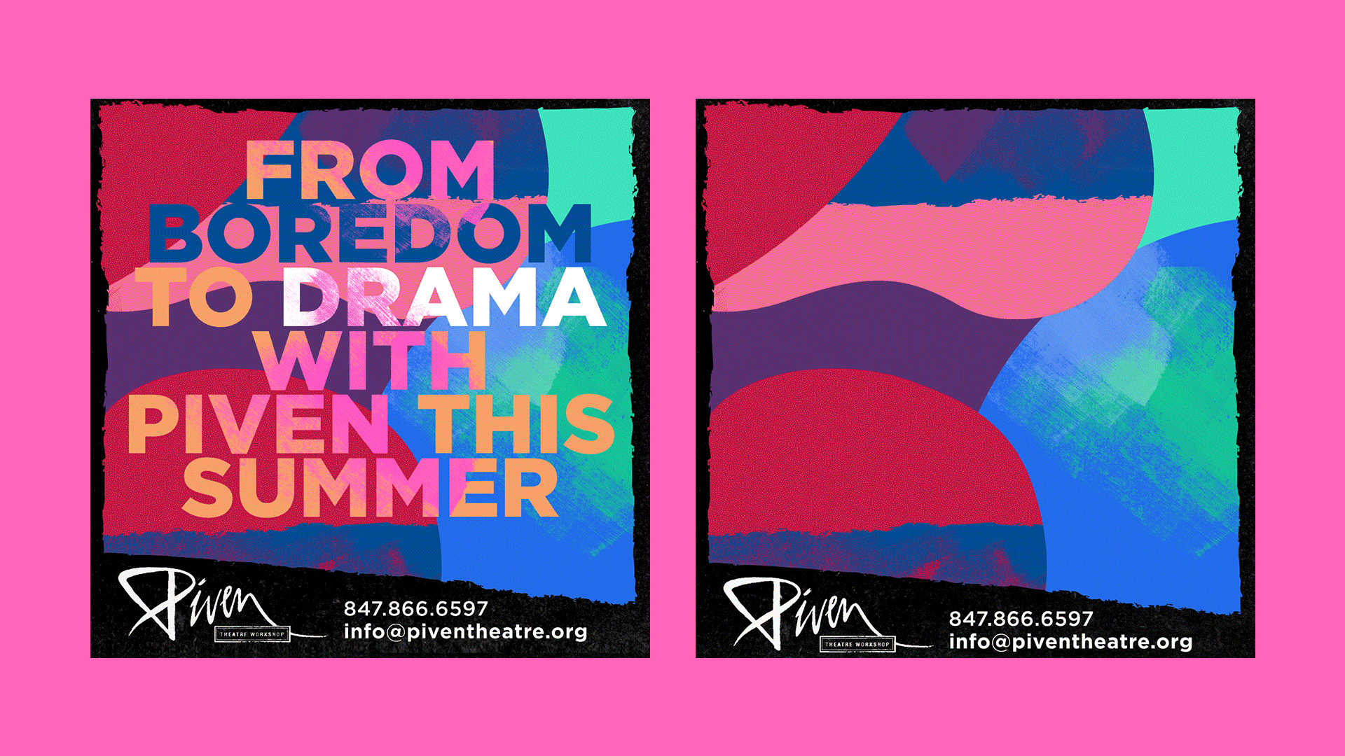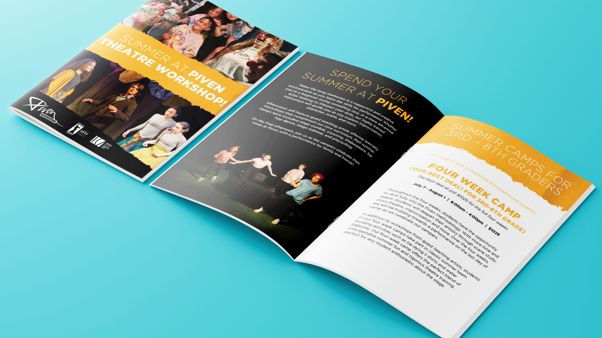 Piven Theatre Workshop is a renowned theater and acting school in Evanston, Illinois with a strong emphasis on community and outreach. Their aesthetic is colorful and playful, while retaining a level of sophistication. Every season I find new ways to use Piven’s signature “torn paper” element, from origami to hand-painted paper to photo collage using paper textures. The key is to create subtle visual distinctions between all the different programs that Piven offers.